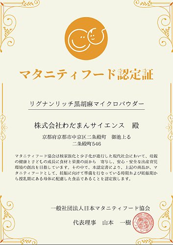 マタニティフード協会より、黒ごま生活(原料:リグナンリッチ黒胡麻マイクロパウダー)が、妊婦の方にも安心して食べて頂ける食品として認定されました。